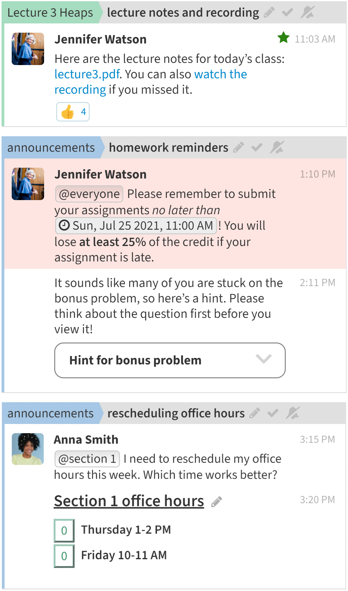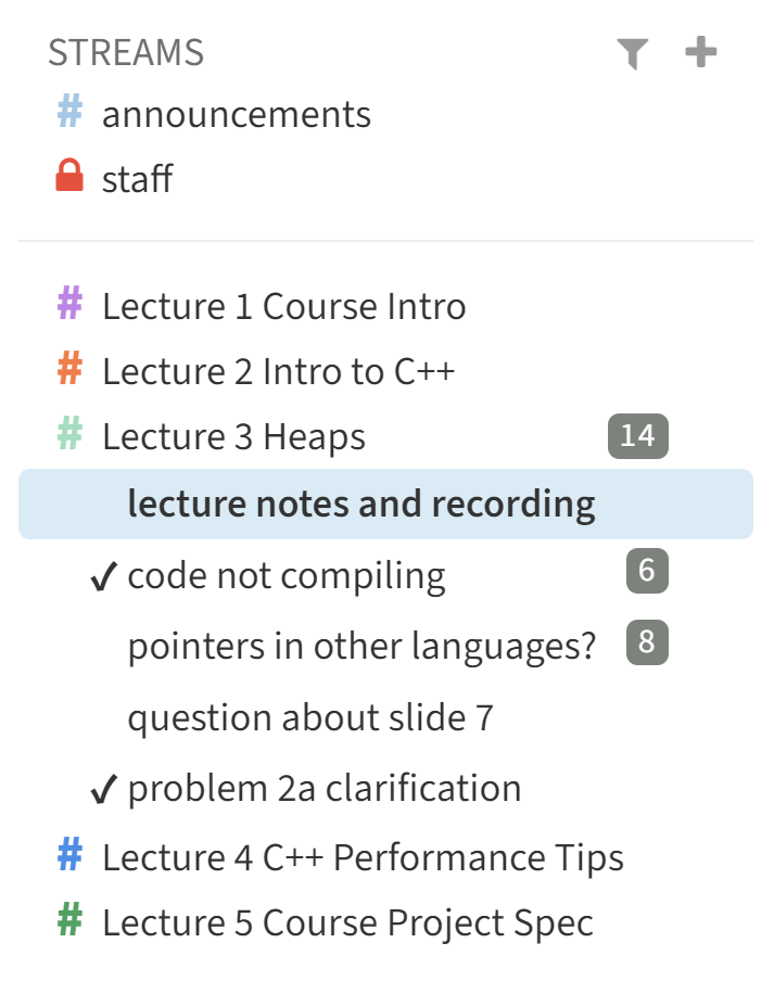 Participants across six continents signed up for my graduate-level classes when I decided to open them up to the world during the pandemic. Zulip became a central hub for asynchronous Q&A and posting Zoom links for lectures, whiteboard PDFs, and announcements. Zulip’s topics, and the ability to change the topic of someone else's message, has made it much easier for me to keep things coherent. It’s super easy to discuss technical material using the TeX integration, and spoilers are a great way to answer questions about homework without depriving students of a chance to keep thinking about the problem on their own.