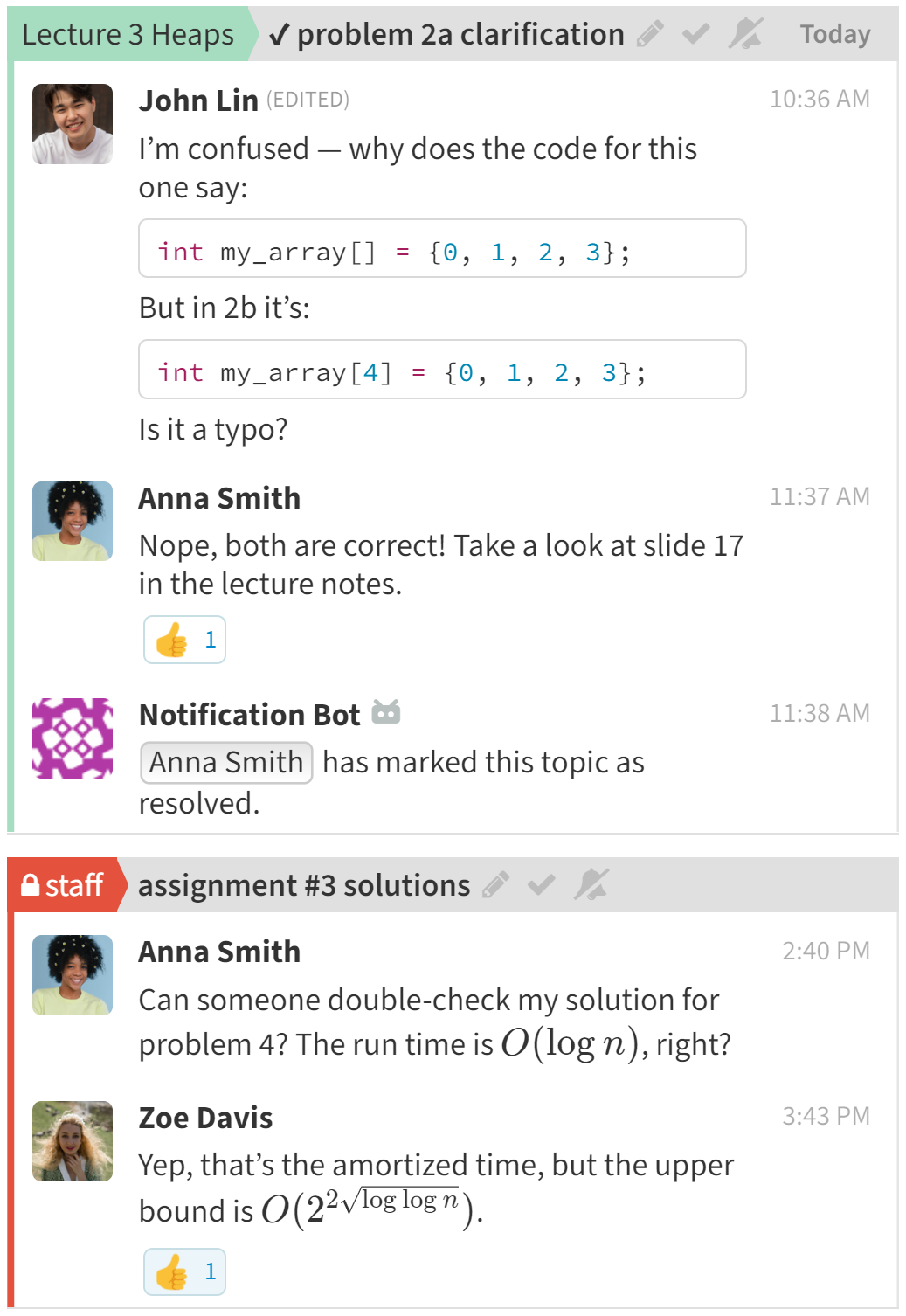 Zulip is the only modern team chat app that is ideal for both live and asynchronous conversations. Post lecture notes and announcements, answer students’ questions, and coordinate with teaching staff all in one place.